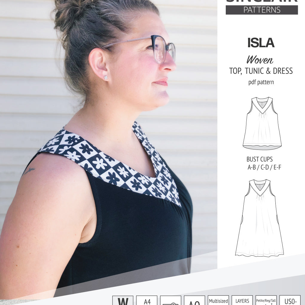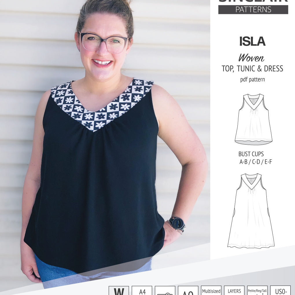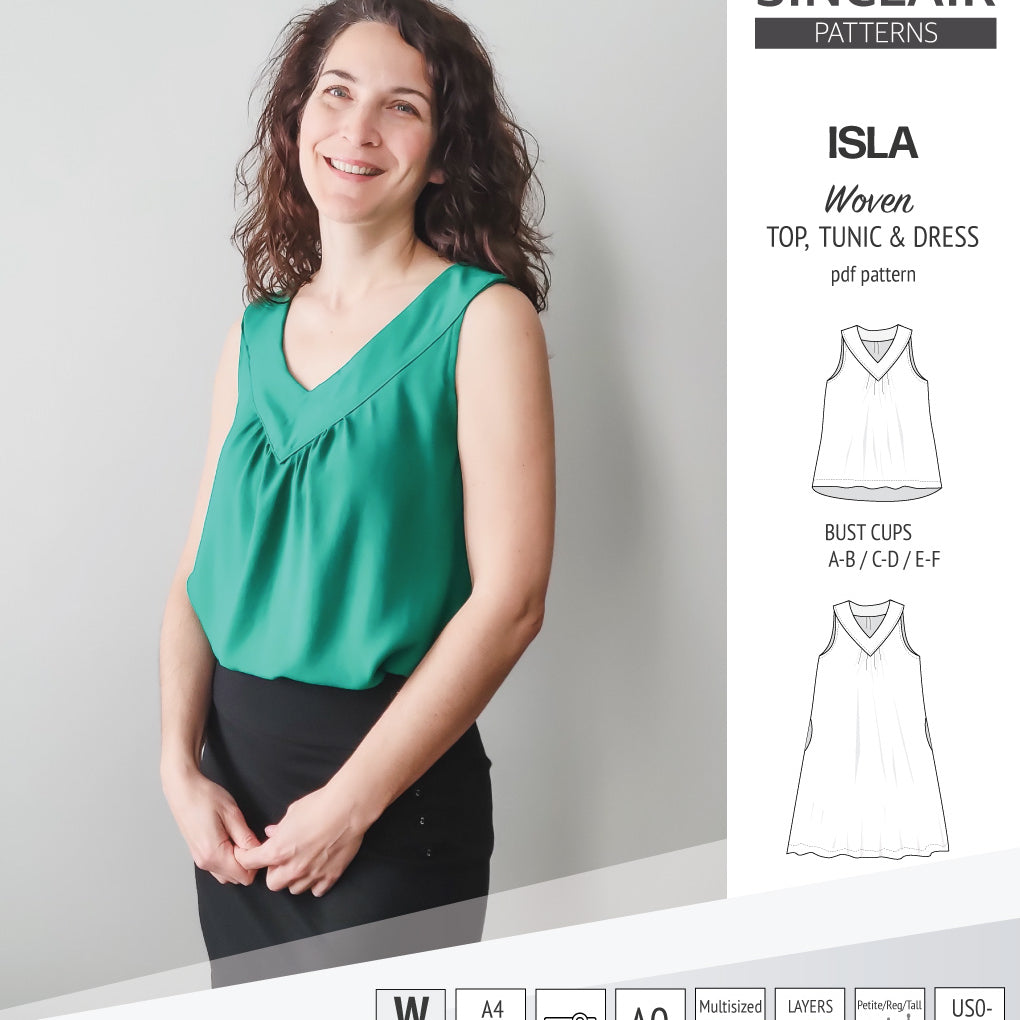 Isla V-neck sleeveless top, tunic and dress for woven and knit fabrics (PDF)