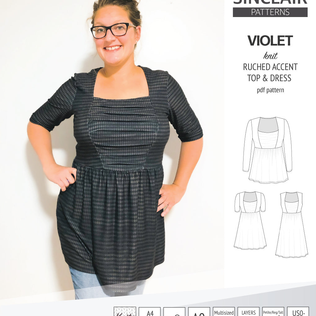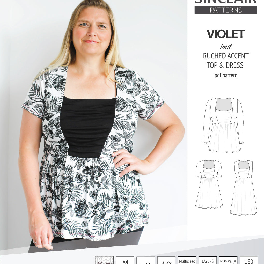 Violet ruched front accent top, tunic and dress for knit fabrics (PDF)