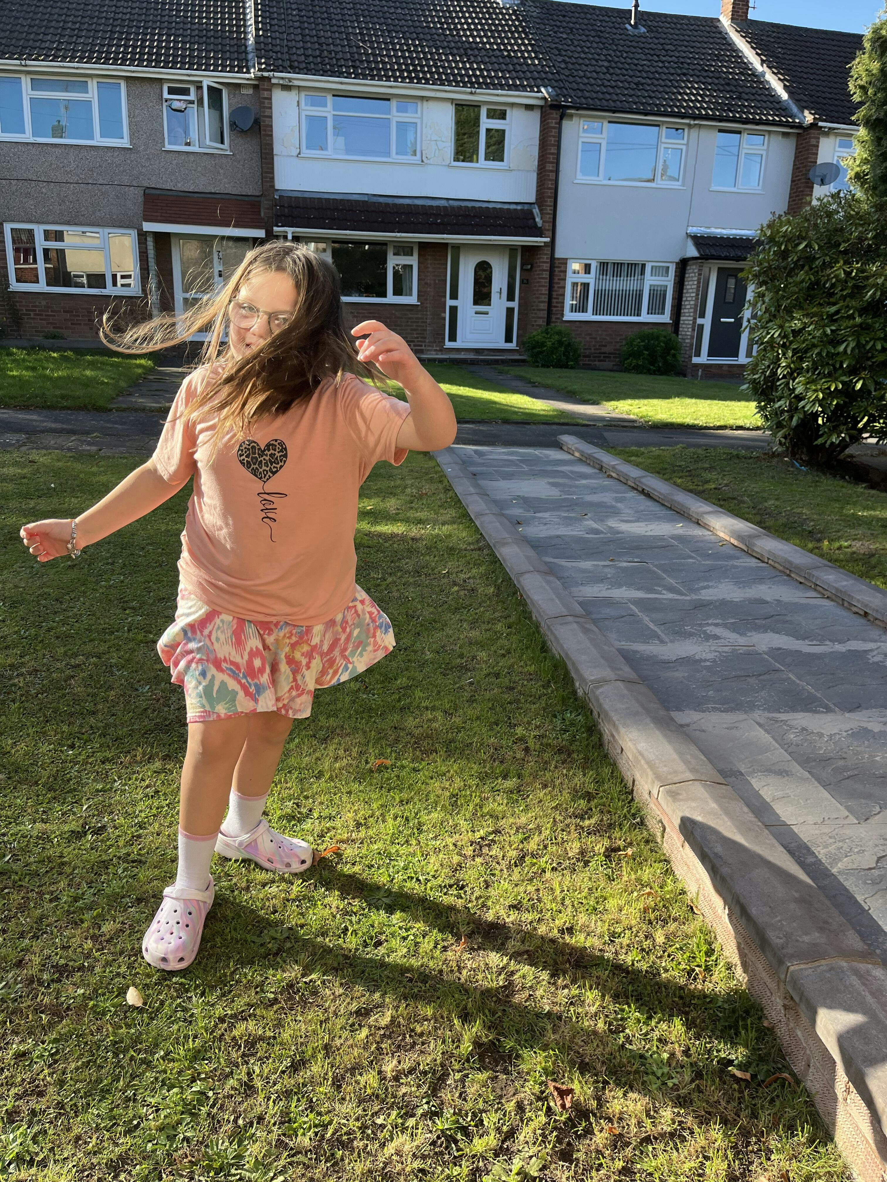 Fitted classic everyday leggings for children offered in full, capri and shorties lengths and can be finished with a regular elasticated or regular or tall yoga waistband. Legs might be finished with regular hems or cuffs. Optional 3/4 circle medium or short length skirt, with straight or hi-lo hem and attached to the waistline and optional knee patches.