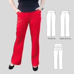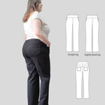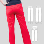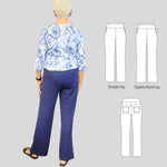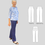 Fit and options: Fitted at the hips and waist, straight or slightly flared leg pants designed for medium to heavy weight knit fabrics like ponte, crepe double knits and similar. Contouring yoke at the back. Finished with contoured waistband that is reinforced with elastic. Optional faux fly, side and back patch pockets.