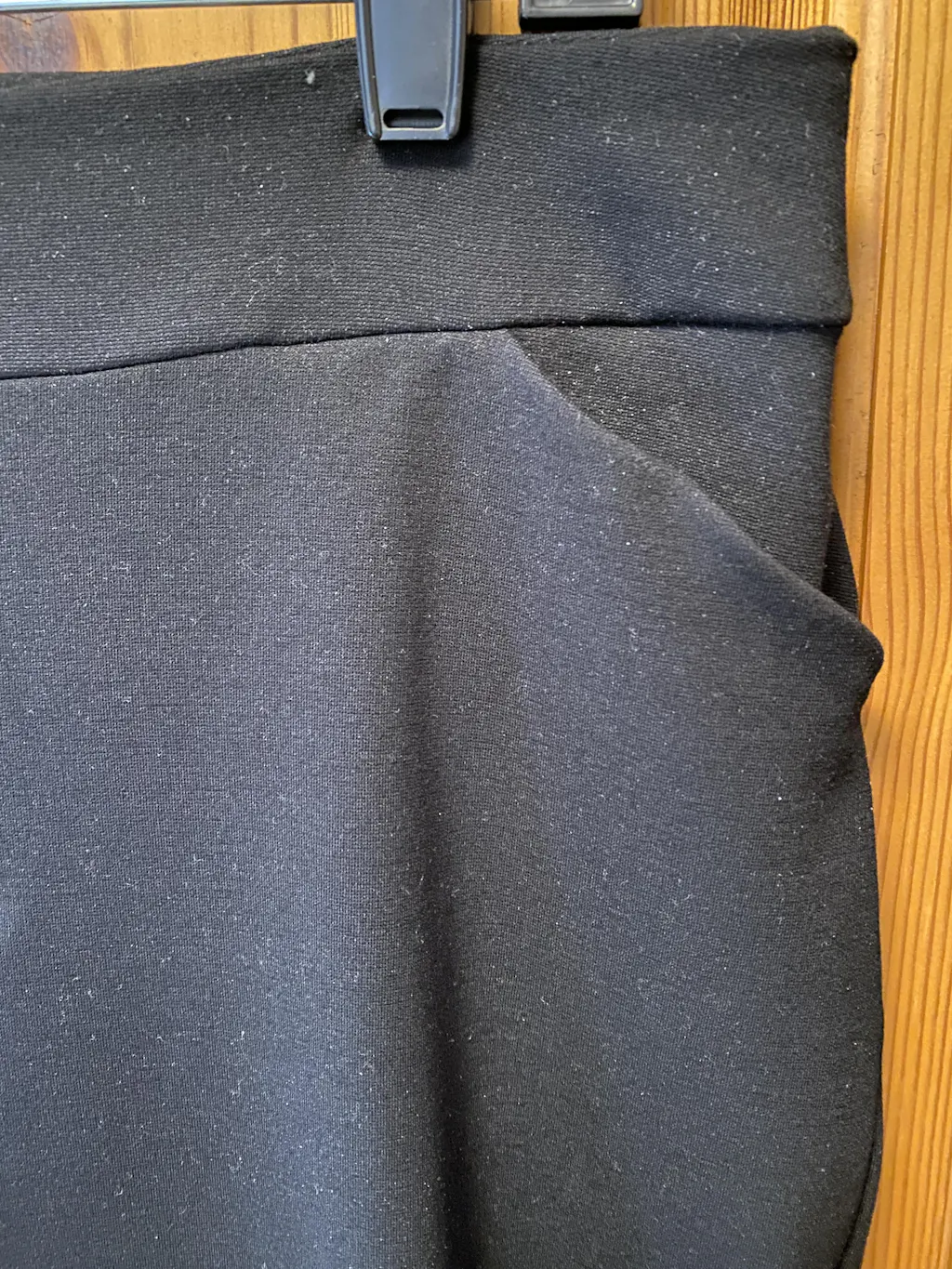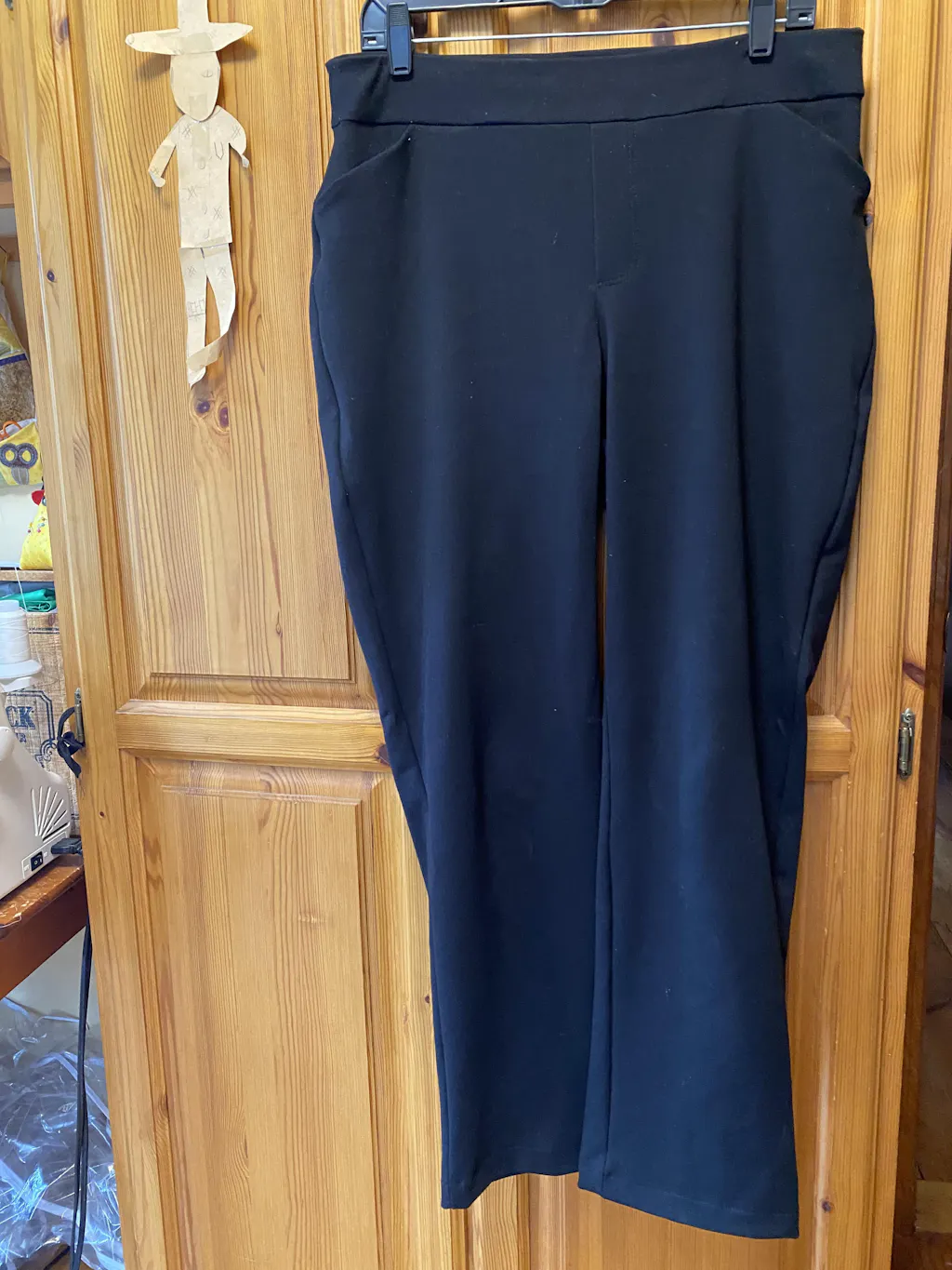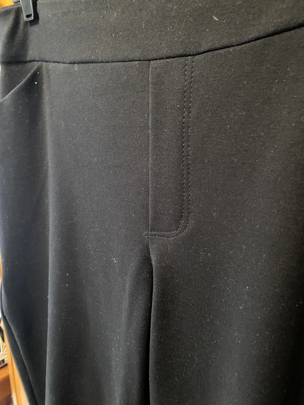Fit and options: Fitted at the hips and waist, straight or slightly flared leg pants designed for medium to heavy weight knit fabrics like ponte, crepe double knits and similar. Contouring yoke at the back. Finished with contoured waistband that is reinforced with elastic. Optional faux fly, side and back patch pockets.