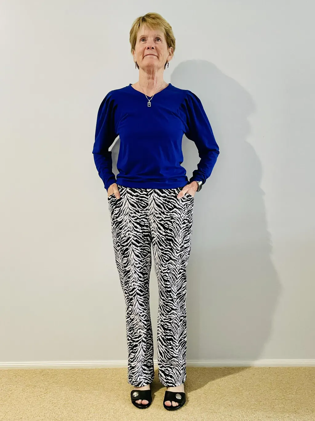 Fit and options: Fitted at the hips and waist, straight or slightly flared leg pants designed for medium to heavy weight knit fabrics like ponte, crepe double knits and similar. Contouring yoke at the back. Finished with contoured waistband that is reinforced with elastic. Optional faux fly, side and back patch pockets.